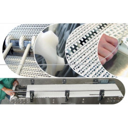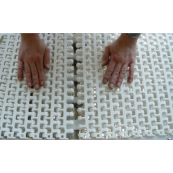 Hygiene: oval hole open hinge patented Habasit dynamic streamline access to the rod articulated on the entire width of the band. Joint construction redirects the water flow to